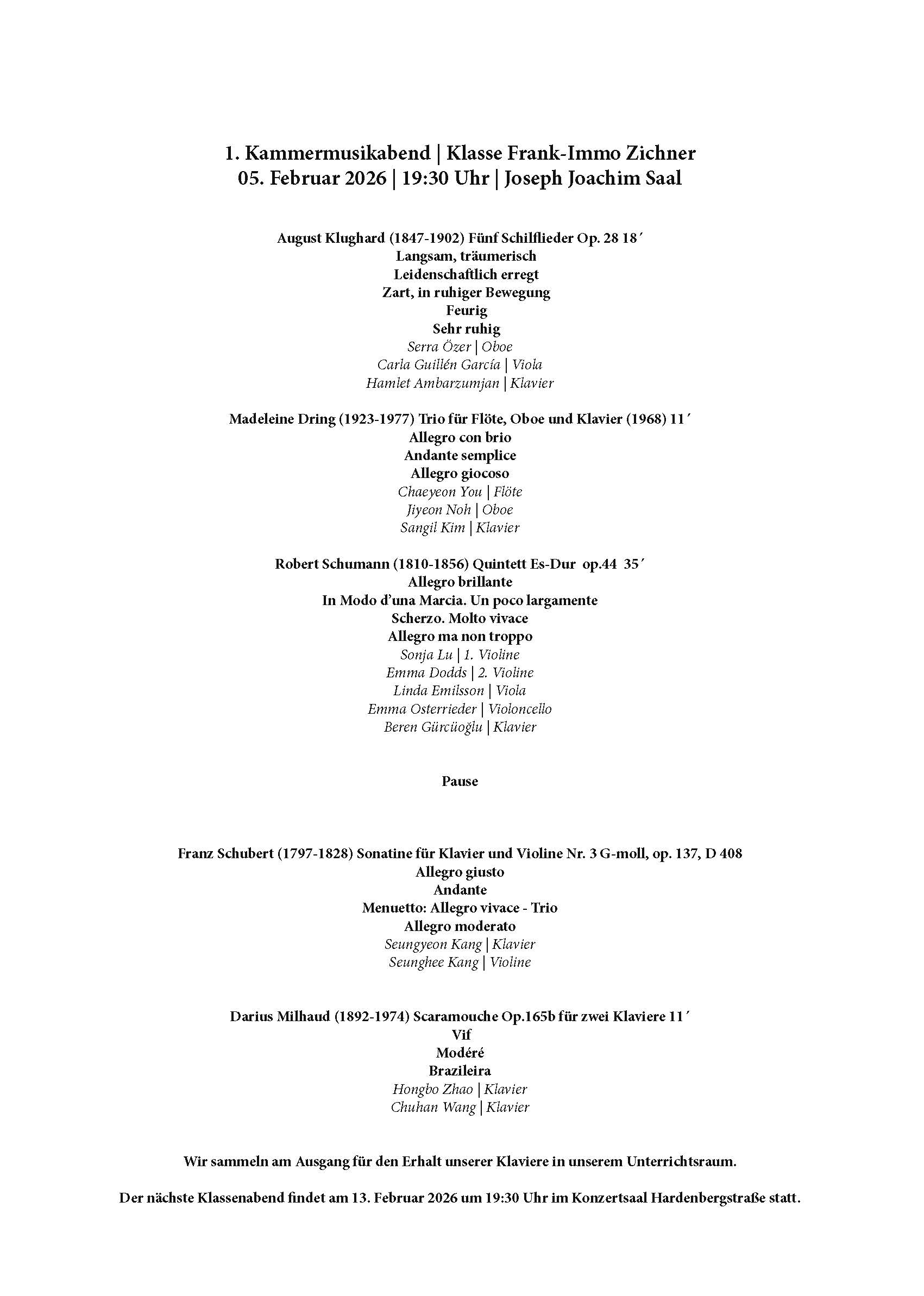 05.02.2026 Berlin UdK Joseph-Joachim-Konzertsaal | 19:30 Uhr 1. Klassenabend der Kammermusikklasse Frank-Immo Zichner